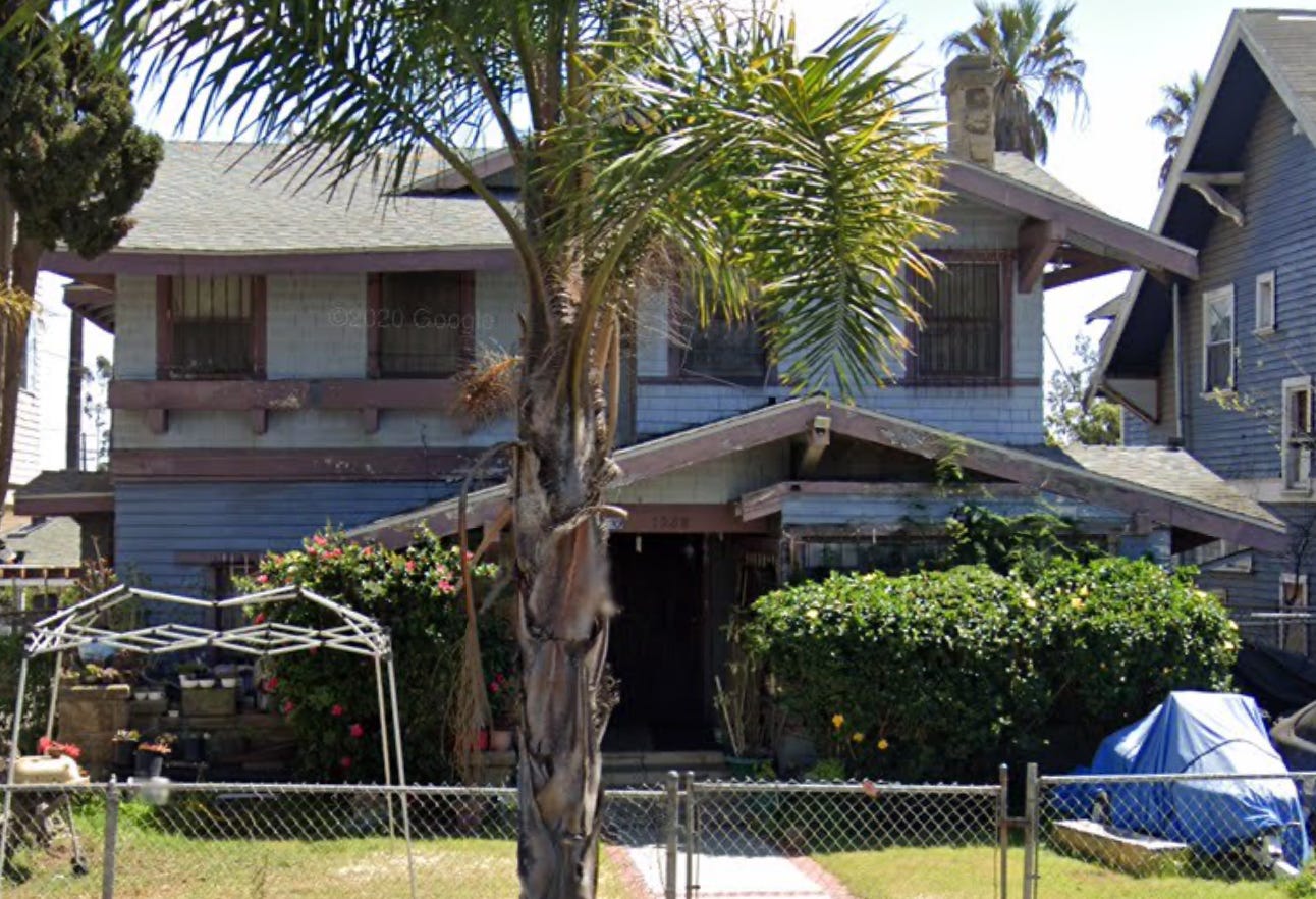 1970 South La Salle Avenue is (was?) a big, beautiful 1907 Craftsman, despite the deferred maintenance. (The initial LAFD Alert reports it was 2008 South La Salle, on the next block, but 2008 is a 1960s multifamily building with only one code complaint on file, and it appears to be in good condition. The incident was updated with the correct address.)