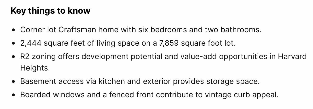 I suspect the listing was at least partially generated by an AI chatbot, since one sentence reads “Boarded windows and a fenced front contribute to vintage curb appeal.” I’m screenshotting it here in case the listing gets edited.