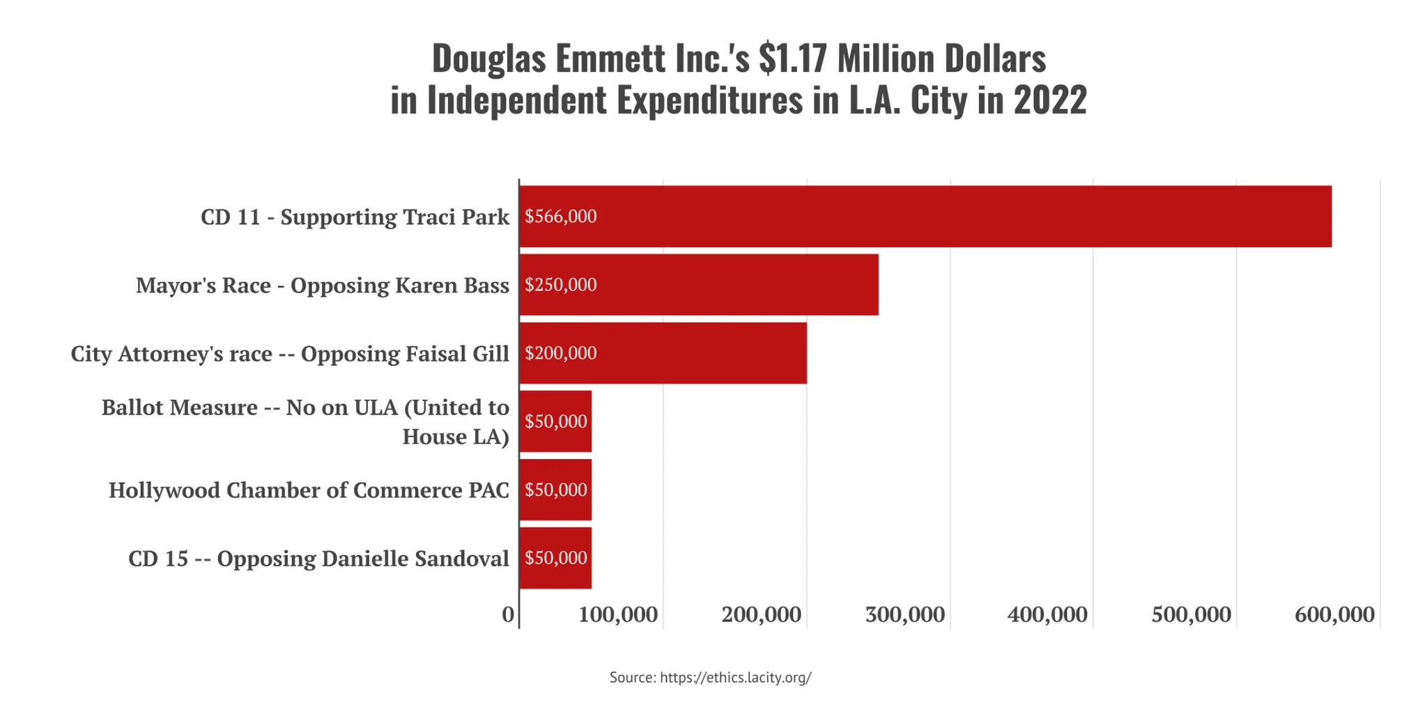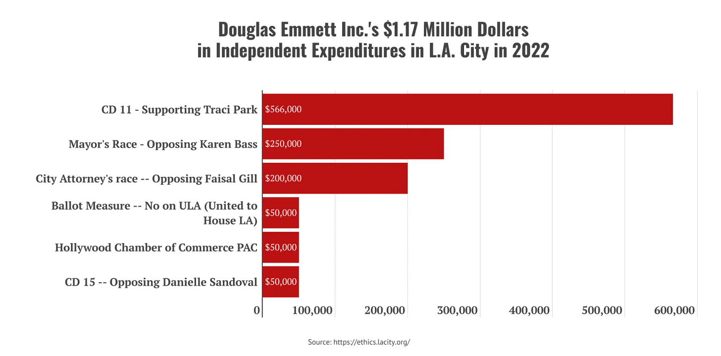 In fact, thanks to an important new piece from Capital and Main, you can read all about Douglas Emmett Inc.'s $1.17 MILLION dollars in political expenditures all over the city in 2022 alone. Hell, thanks to Capital and Main (with data provided by ethics.lacity.org), you can simply look at the chart screenshotted from the article.