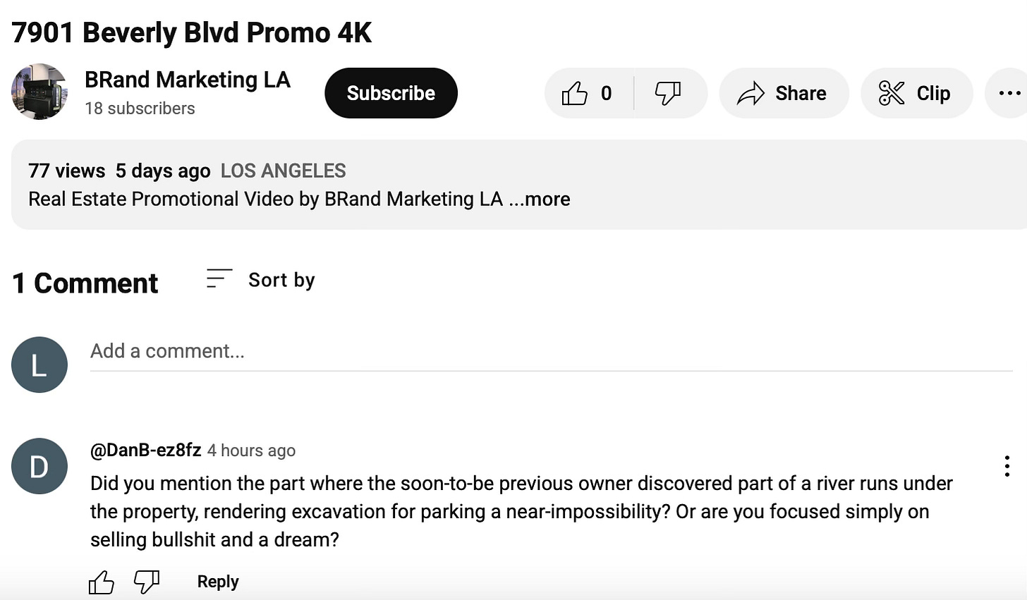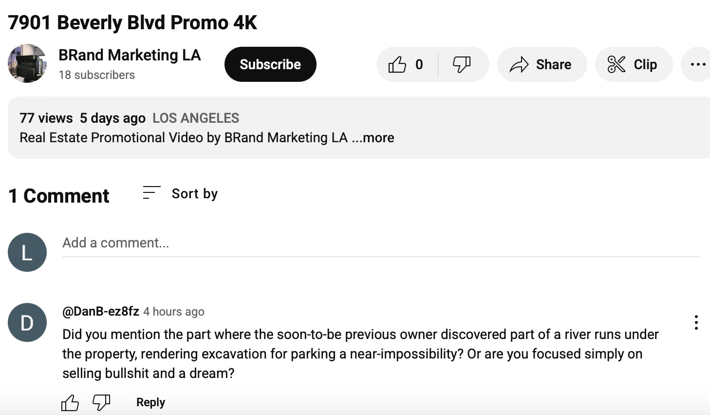 There’s a promotional video for the listing. I’ve screenshotted the lone comment in case it gets deleted (see below):